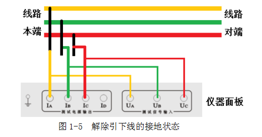 測(cè)試兩條輸電線路間的互感時(shí),被測(cè)線路測(cè)量端和對(duì)端三相分別短接,對(duì)端接大地,將儀器輸出A和電壓測(cè)量端子UA分別接入被測(cè)線路1和被測(cè)線路2的測(cè)試引下線,如圖1-17和1-18。