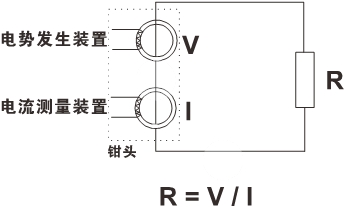 見下圖。鉗表的鉗口部分由電壓線圈及電流線圈組成。電壓線圈提供激勵(lì)信號(hào),并在被測(cè)回路上感應(yīng)一個(gè)電勢(shì)V。在電勢(shì)V的作用下將在被測(cè)回路產(chǎn)生電流I。鉗表對(duì)V及I進(jìn)行測(cè)量,并通過下面的公式即可得到被測(cè)電阻R。