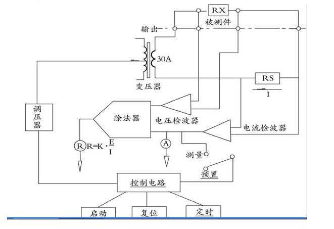 3)接上負(fù)載,按一下“啟動”按鈕,調(diào)節(jié)“電流輸出”,來調(diào)節(jié)測試電流至規(guī)定值,即可進(jìn)行測試,此時(shí)“mΩ”表將顯示被測件的電阻值。如果被測件電阻等于或大于電阻預(yù)置值,則儀器將超阻報(bào)警,蜂鳴器發(fā)出響聲,超限黃燈點(diǎn)亮,輸出電流被切斷,表示被測件不合格,按一下復(fù)位按鈕,解除報(bào)警,方可進(jìn)行下次測試。如果測試電流超過30A,也會產(chǎn)生過流聲音警示現(xiàn)象。由于負(fù)載不完全一樣,測試時(shí)需調(diào)節(jié)“電流調(diào)節(jié)”至所需測試電流。