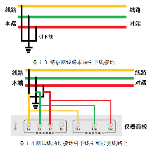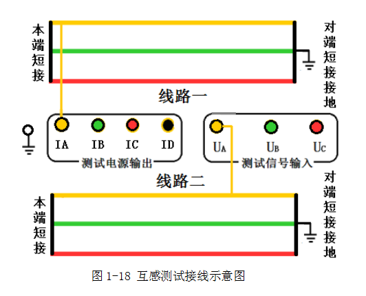 測(cè)試兩條輸電線路間的互感時(shí),被測(cè)線路測(cè)量端和對(duì)端三相分別短接,對(duì)端接大地,將儀器輸出A和電壓測(cè)量端子UA分別接入被測(cè)線路1和被測(cè)線路2的測(cè)試引下線,如圖1-17和1-18。