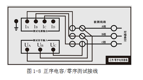 在正序電容測(cè)試中,被測(cè)線路對(duì)端開路,將儀器電源輸出至被測(cè)線路測(cè)量端外側(cè)電流引下線,電壓測(cè)量輸入端接至電壓引下線,如圖1-7。